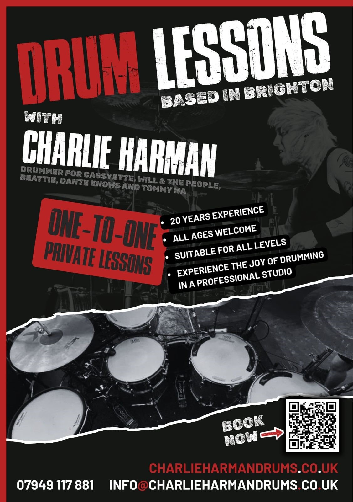 Unlock the rhythm within you with drum lessons from Charlie Harman, a Grade 8 certified drummer since the age of 15.